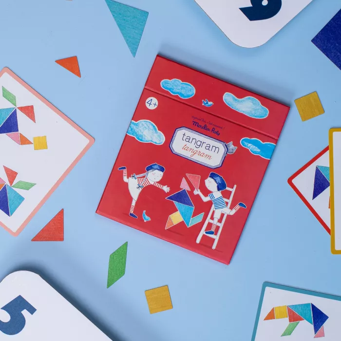 Tangram magnétique pour développer la logique et la réflexion. Sur la planche magnétique, tente de reproduire les figures représentées sur les 9 cartes recto-verso en assemblant les pièces du tangram aux différentes formes.