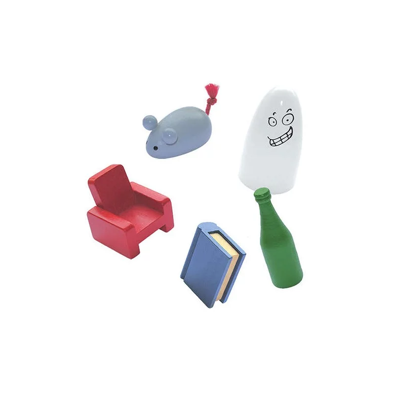 Pour les pièces en bois : la bouteille est verte, le fantôme est blanc, le fauteuil est rouge, le livre est bleu et la souris est grise ! Mais sur les cartes, toutes ces couleurs se mélangent… Il y a 2 objets sur chaque carte, et dès que l’une d’elle est retournée, il s’agit d’être le plus rapide à choper le bon objet : si la carte présente un objet de la bonne couleur, il faut vite l’attraper ; mais si les 2 objets représentés ne sont pas de la bonne couleur, alors il faut vite attraper l’objet qui n’a rien de commun avec la carte : ni l’objet, ni la couleur !