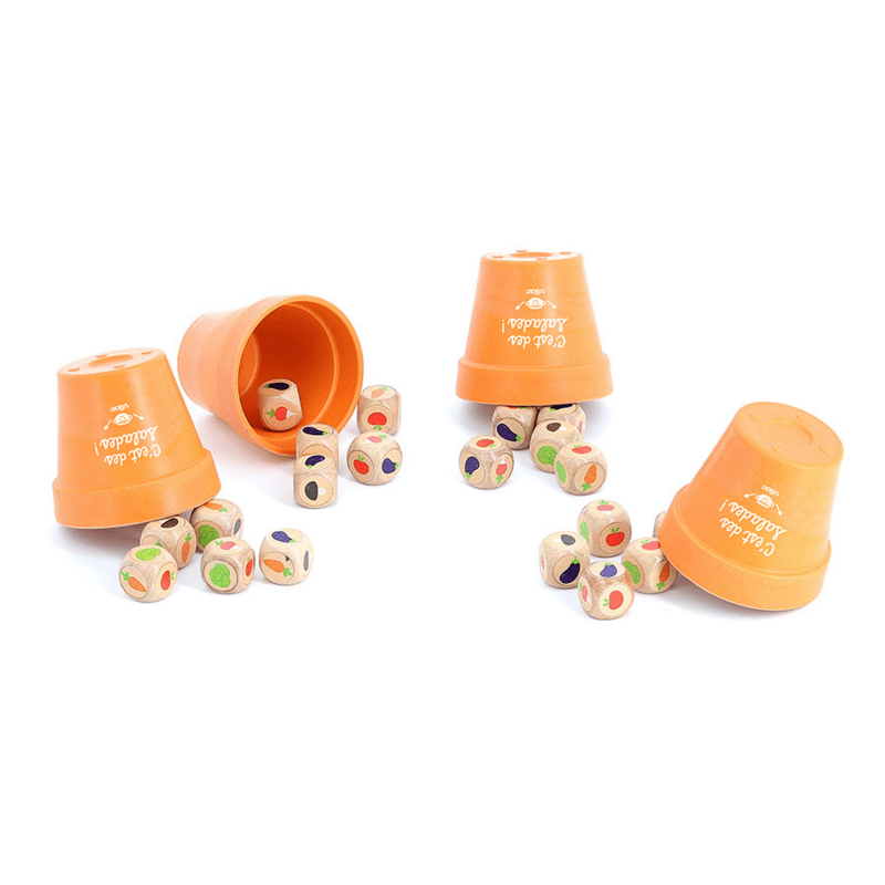 Le but du jeu est d’essayer de deviner combien de motifs identiques sont cachés sous les pots er de faire perdre aux autres joueurs tous leurs dés. Alors combien de tomates se cachent sous les pots ? Est-ce que l’adversaire raconte des salades ? D’accord pas d’accord ? Allez je surenchéri !