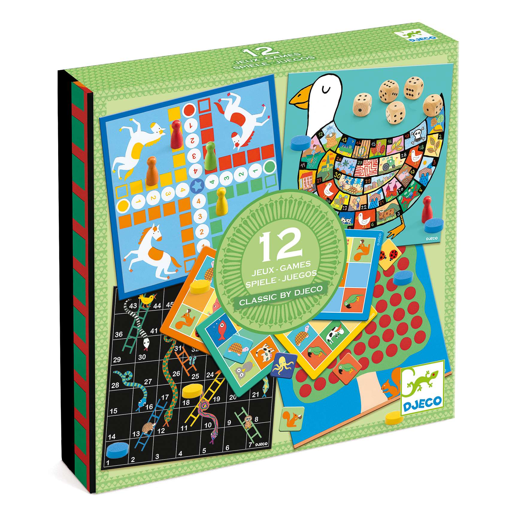 Un coffret de 12 jeux de société pour les enfants à partir de 4 ans. Un jeu de petits chevaux, un jeu de l’oie, un jeu échelles et serpents, un jeu de morpion, un mémo, un loto, un yam des petits et des jeux de dés. Un très beau coffret cadeau ludique pour jouer seul ou à plusieurs. Pour jouer de 1 à 4 joueurs à partir de 4 ans Dimensions de la boite : 30 x 30 x 4,5 cm