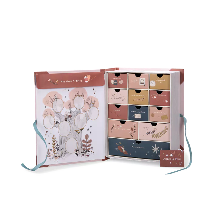 Coffret à trésors pour conserver les souvenirs de bébé dans chacun des tiroirs … Se referme avec de jolis liens et reprend les tendres illustrations des personnages de la collection Après la pluie à l’intérieur comme à l’extérieur.