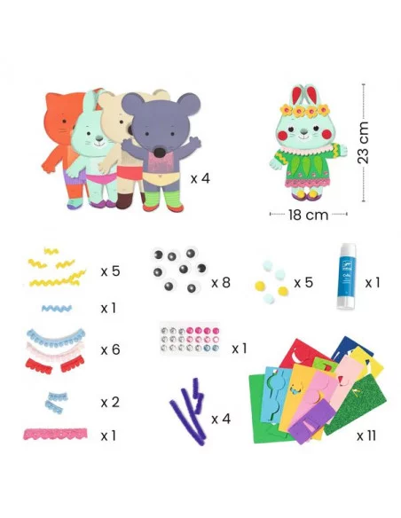Ce coffret créatif comprend tout le nécessaire pour décorer d’adorables animaux (une souris, un ours, un chat et un lapin) avec une multitude d’éléments aux textures variées (feutrine, mousse, sequins, rubans, pompons, yeux mobiles).