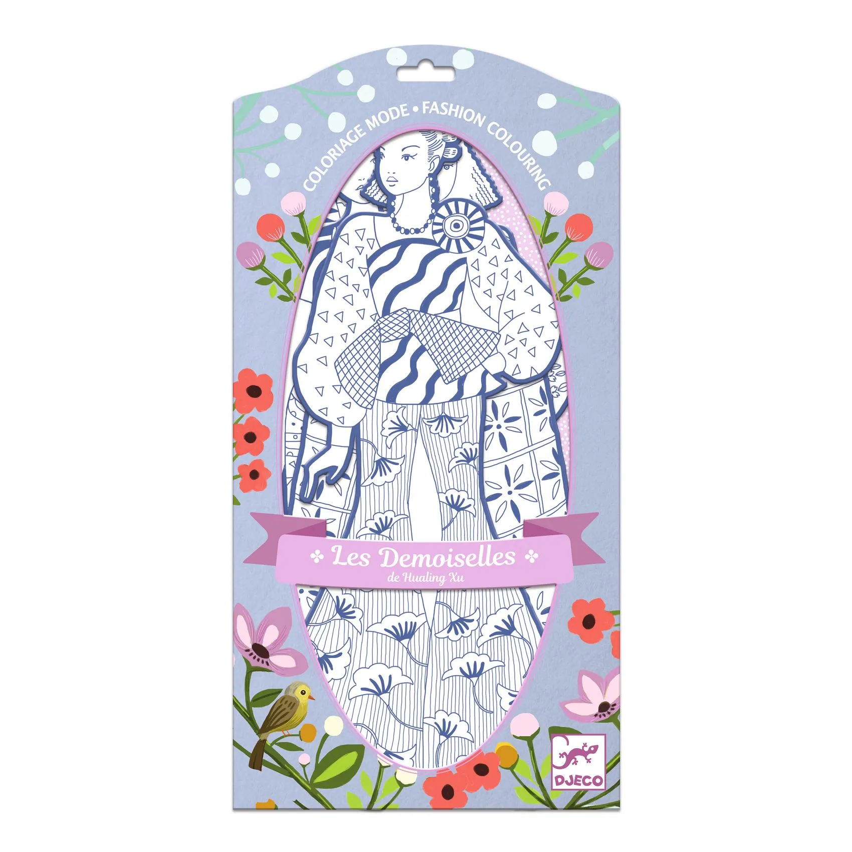 Découvrez la pochette Coloriage mode Angèle & ses amies de la collection Les Demoiselles de Djeco, 4 grandes silhouettes sur le thème de la mode à colorier dès 6 ans.