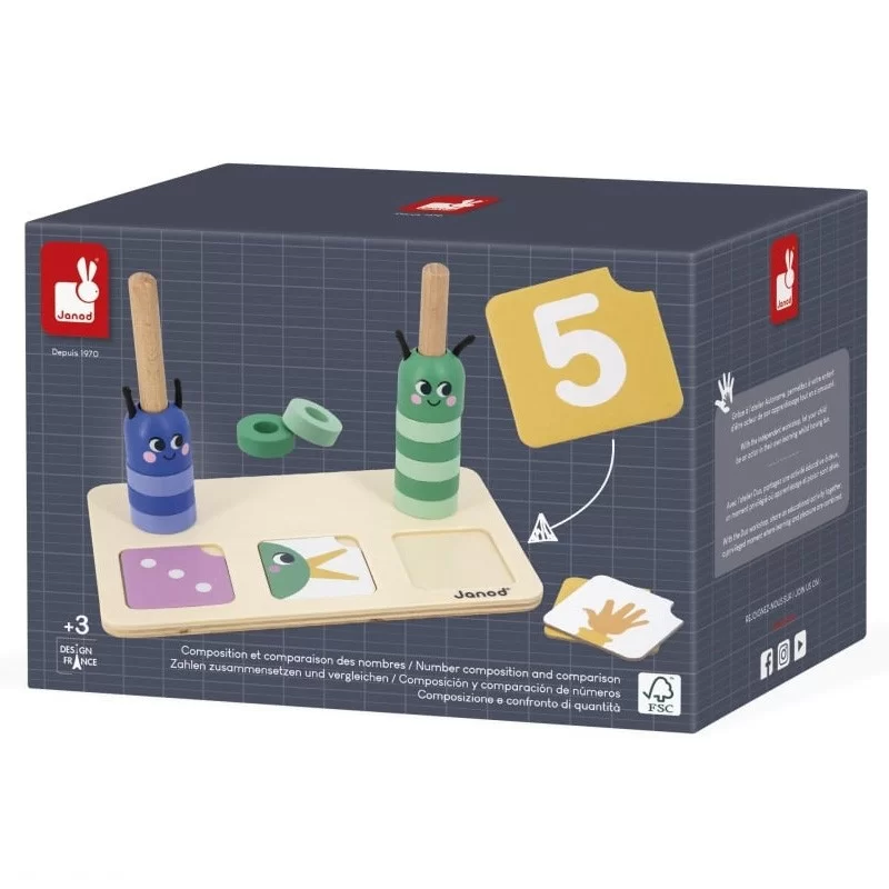 Qui mieux que deux jolies chenilles pour accompagner votre enfant dans l’apprentissage des chiffres et des ordres de grandeur ? En enfilant les pièces colorées sur le support, votre enfant comprendra combien il faut ajouter ou enlever de perles au corps de la chenille pour obtenir une quantité. Ce jeu est adapté au rythme d’apprentissage de chaque enfant. Ainsi, une fois le nombre composé votre enfant pourra aborder la notion de comparaison « plus grand que » et « plus petit que ». Idéal pour apprendre en s’amusant !