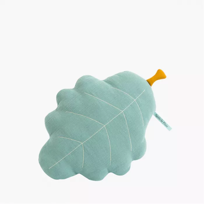 Coussin déco ou dodo en lange de coton biologique, en forme de pomme avec ses deux feuilles à motif fleuri. Prune, turquoise, ocre… de jolies couleurs dans la chambre de bébé !