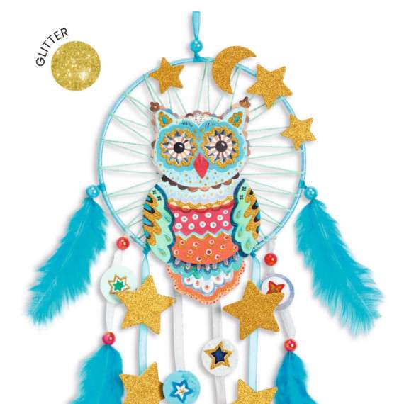 Contenu: 2 planches illustrées et prédécoupées en carton souple avec effet pailleté, 1 cercle enrubanné, 4 écheveaux (2 cotons et 2 rubans), plumes, perles, 2 aiguilles à broder, adhésifs double-face et 1 notice explicative en couleur