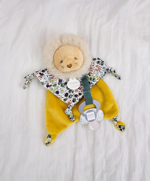 Le Doudou Attache-sucette Lion a une jolie frimousse, des matières douces combinées à de fraîches textures, une multitude de nouettes à manipuler et un imprimé exclusif signé DOUDOU ET COMPAGNIE !