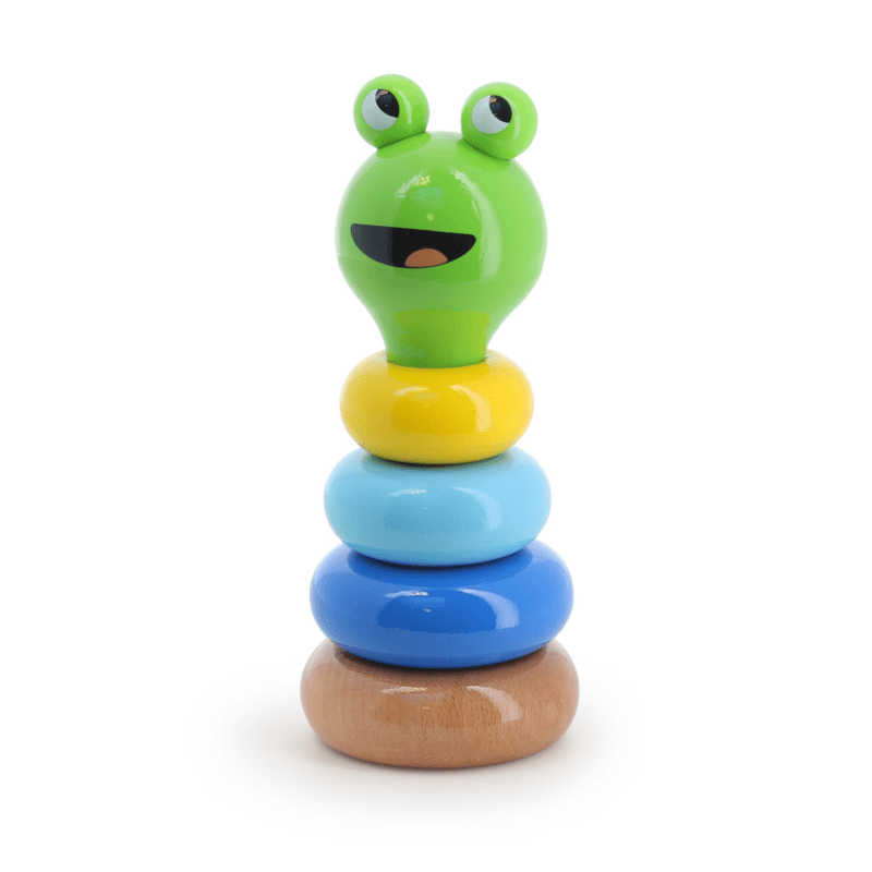 Empilez, jouez et recommencez ! Babeth la rainette se transforme en un adorable jouet à empiler en bois coloré.