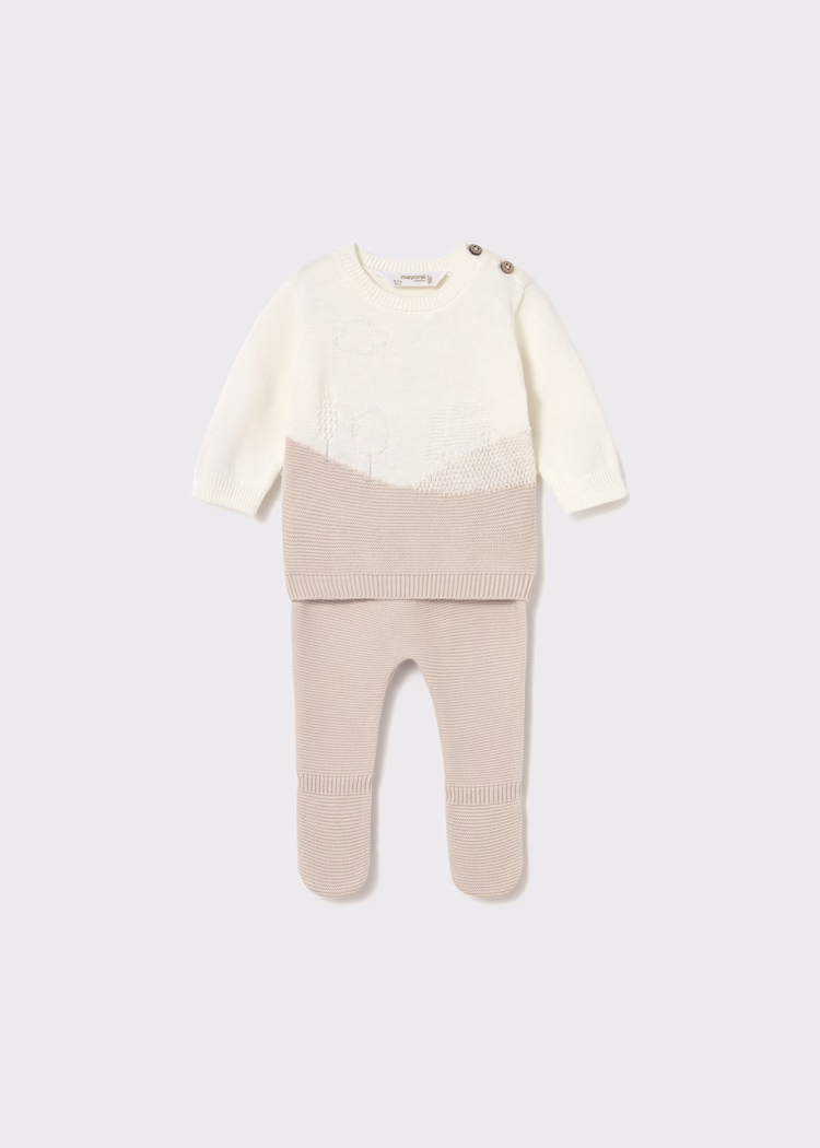 Ensemble deux pièces en tricot pour nouveau-né, composé d’un pull et d’un legging assortis.