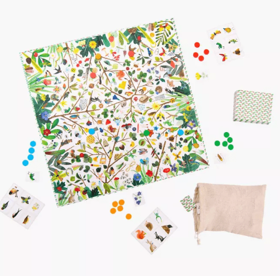 Jeu d’observation aux jolies illustrations du jardin imprimées sur un plateau. 24 planches par thème, 200 cartes et 24 pions colorés. Qui sera le plus rapide à trouver les illustrations du plateau ? Idéal pour jouer en famille ou avec les copains.