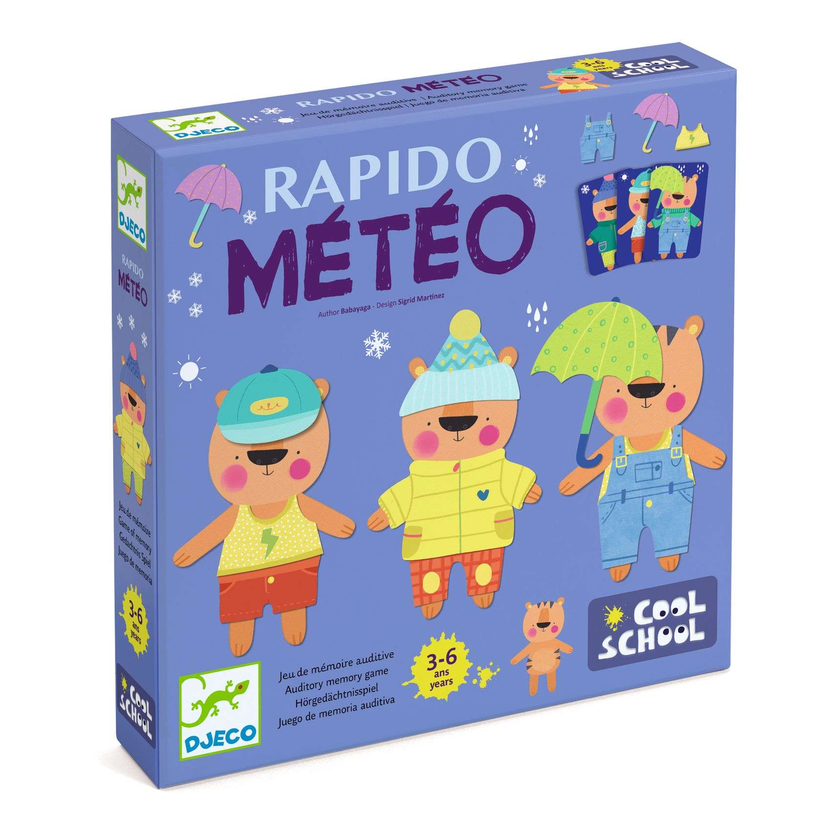 Découvrez Rapido Météo de la collection Cool School de Djeco, un jeu dans lequel mémoire auditive et rapidité seront les clés pour gagner. Un jeu de société pour les enfants à partir de 3 ans.