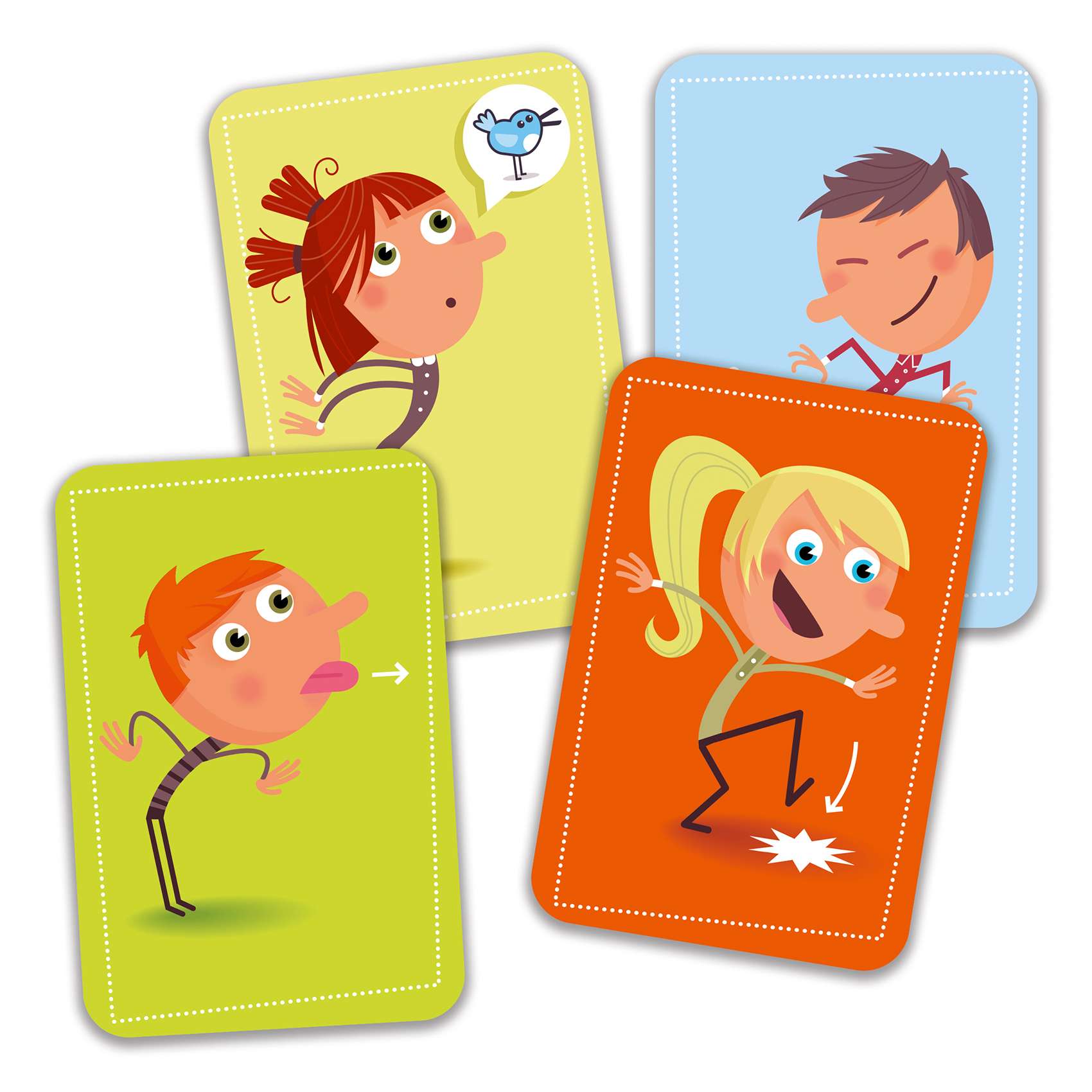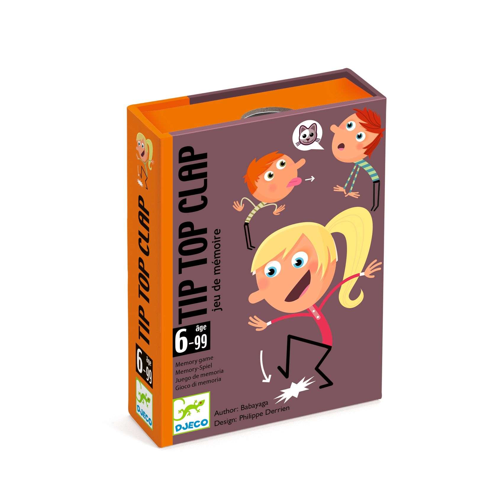 Jeu de mémoire – Tip Top Clap Une suite de bruits et de mimes se crée et s’allonge au rythme du jeu… Rires assurés pour ce jeu de mémoire inédit ! Les règles sont simples. Le premier joueur tire la première carte du paquet placé au centre de la table face cachée. Il doit imiter le bruit ou mimer ce qui est indiqué sur la carte. Le joueur suivant doit à son tour tiré la carte suivante et réaliser le mime ou le bruit indiqué puis répéter celui de la carte précédente. Le troisième effectue le même geste et doit répéter les mimes ou bruits des cartes précédentes. Et ainsi de suite jusqu’à ce qu’un joueur se trompe. Dans ce cas il prend la carte retournée en guise de pénalité. Puis la partie continue jusqu’à épuisement du paquet. Le but du jeu étant d’avoir le moins de cartes de pénalité possible en fin de partie. Ce jeu de cartes se joue en famille ou entre amis. Qui d’entre vous aura le plus de mémoire ??