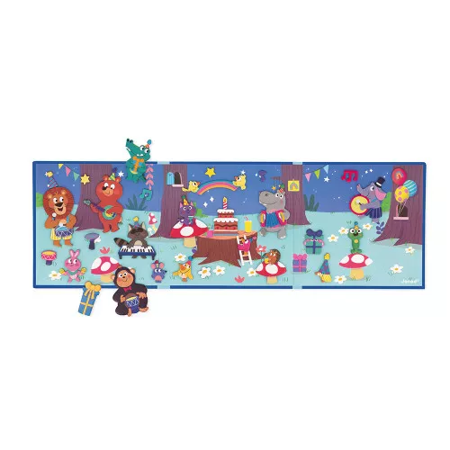 Vite, approchez ! La nuit vient de tomber dans la forêt et une grande surprise se prépare. Ce jeu magnétique émerveillera vos enfants dès 3 ans. Ce décor illustré servira de support à l’imagination et la motricité fine de votre tout-petit. En effet, ce jeu magnétique se compose d’une grande planche décorée ainsi que de 30 magnets. Les aimants, une fois déposés sur le panorama festif, seront le point de départ d’une multitude d’histoires merveilleuses ! Tous les animaux sont présents et une bougie se dresse au milieu de tout le monde, quand la musique commence alors à retentir ! Après tout, de qui fête-t-on l’anniversaire ? Seul votre enfant le décidera. Ce grand décor est pliable et pourra donc facilement être rangé ou glissé dans le sac à dos de votre petit. À chaque instant, il pourra alors s’inventer une multitude de petites histoires tout en stimulant sa motricité fine en manipulant les pièces aimantées. Une fois les éléments en place, il ne reste plus qu’à dresser le décor à la verticale et conter son histoire à son auditoire ! Ce jeu aimanté fait partie de la grande collection des Magnéti’stories, des invitations à la rêverie et l’imagination. Ce jeu magnétique est composé de carton certifié FSC™ ainsi que de matériaux contrôlés.