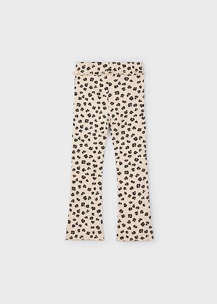 Pantalon legging pour fille. Pantalon style legging pour fille avec une coupe ajustée aux hanches et aux genoux et un ourlet évasé. Coupe normale. Taille élastiquée. Tissu doux et extensible en coton. Motif avec détails sur l’ourlet. Éléments décoratifs : volant décoratif.