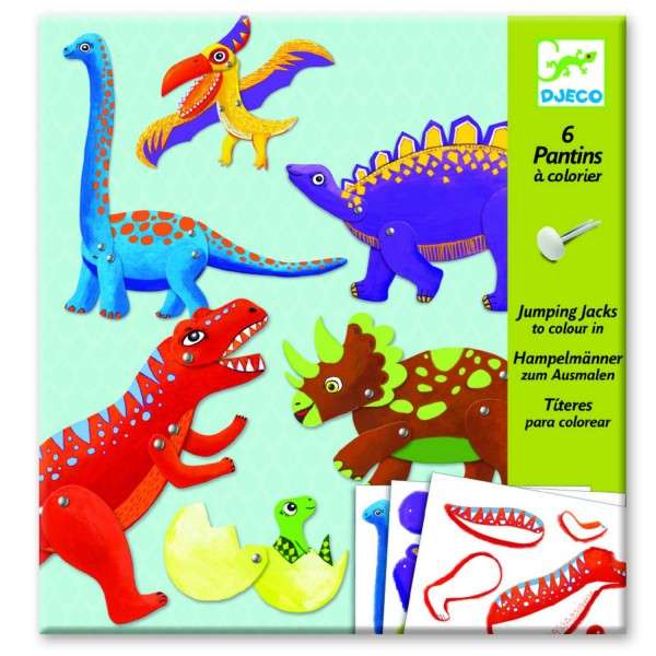 Coloriez les différentes parties des pantins puis assemblez les avec des attaches parisiennes. De sympathiques dinosaures colorés s’animent et vous pouvez alors jouer avec et laisser libre cours à votre imagination