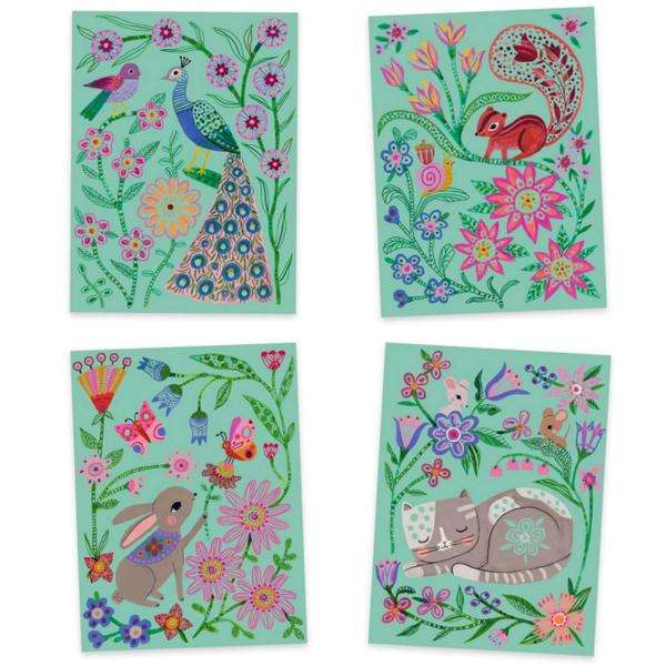A l’aide du stylet de bois, on gratte la surface des cartes en reproduisant les motifs imaginés par l’illustrateur. Petit à petit, les tableaux sont dévoilés et les animaux du jardin se rencontrent dans un décor fleuri !