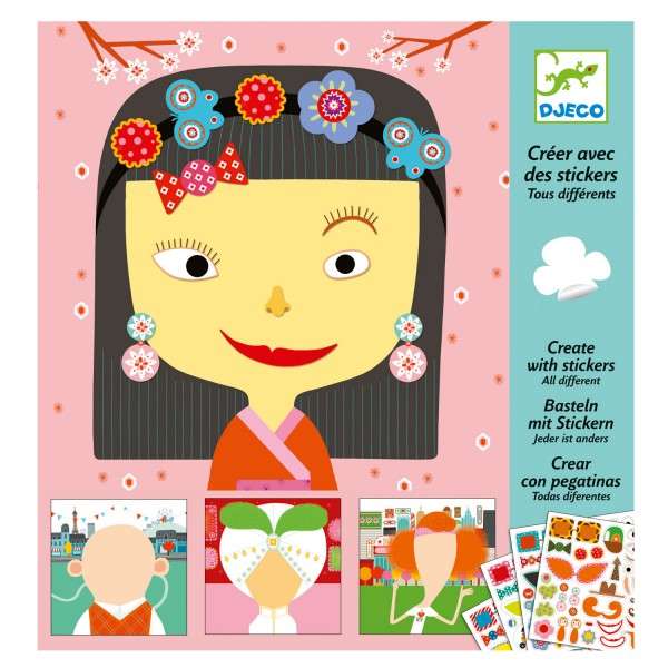 4 tableaux, 4 fonds, 4 débuts de personnages : – un sultan dans son palais – un homme chauve à Paris – une fille rousse en Amérique – une fille brune en kimono devant un mur rose fleuri. Ces quatre personnages n’ont pas d’expressions, ils ne peuvent ni manger, ni voir, ni sentir. Mettez-leur un nez, une bouche, des yeux et pleins d’accessoires qui les rendront unique : chapeau, tatouage, fleur dans les cheveux, lunettes, moustache, barbe, deux yeux différents… Laissez parler votre imagination et votre créativité et créez des personnages uniques ! Dimensions du produit : 22 x 23 cm.