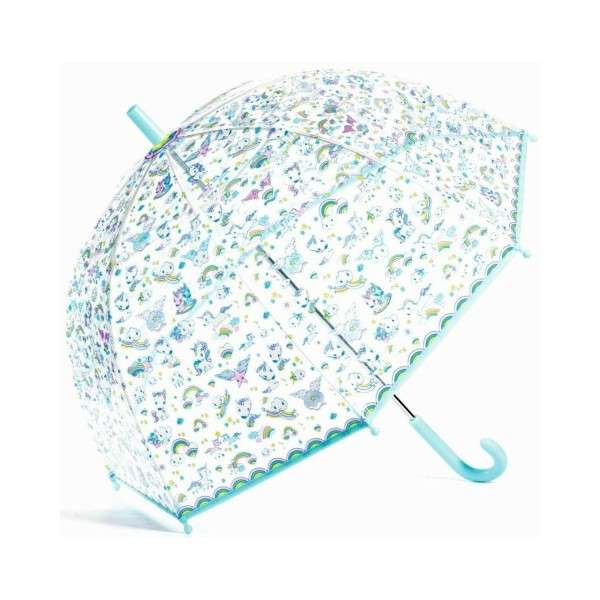 Quelques gouttes de pluie ! Vite sortons notre beau parapluie illustré de la marque Djeco !Un parapluie en plastique transparent de marque Djeco avec de ravissantes illustrations sur le thème des licornes qui devrait ravir votre enfant et le protéger de la pluie.Votre enfant va adorer affronter la pluie protégé par les licornes ! La structure souple et résistante est en fibre de verre.