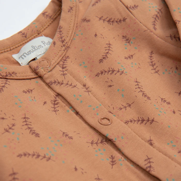 Pyjama argile en jersey de coton pour laisser respirer la peau de bébé. Ouverture par boutons-pression sur le devant et à et l’entrejambe pour faciliter le change de bébé. Finition carbone pour la douceur.