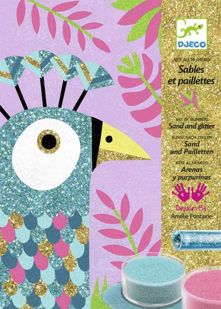 - – Des tableaux de sable enrichis de paillettes pour faire scintiller ses créations. – 1 outil astucieux créé par Djeco pour décoller facilement les parties encollées. – Une activité propre : l’enfant travaille dans la boîte pour éviter d’éparpiller le sable. – Un kit astucieux où la boîte présente un petit trou pour récupérer le surplus de sable et le verser dans les pots à large ouverture. – 1 boîte de rangement avec fermeture élastique pour stocker son matériel une fois l’activité terminée. – 1 livret explicatif détaillant l’activité pas à pas.