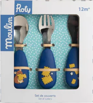 Set de 3 couverts en inox et silicone pour une bonne prise main pour manger comme les grands ! Ils sont joliment illustrés aux couleurs de Puce et Pilou.
