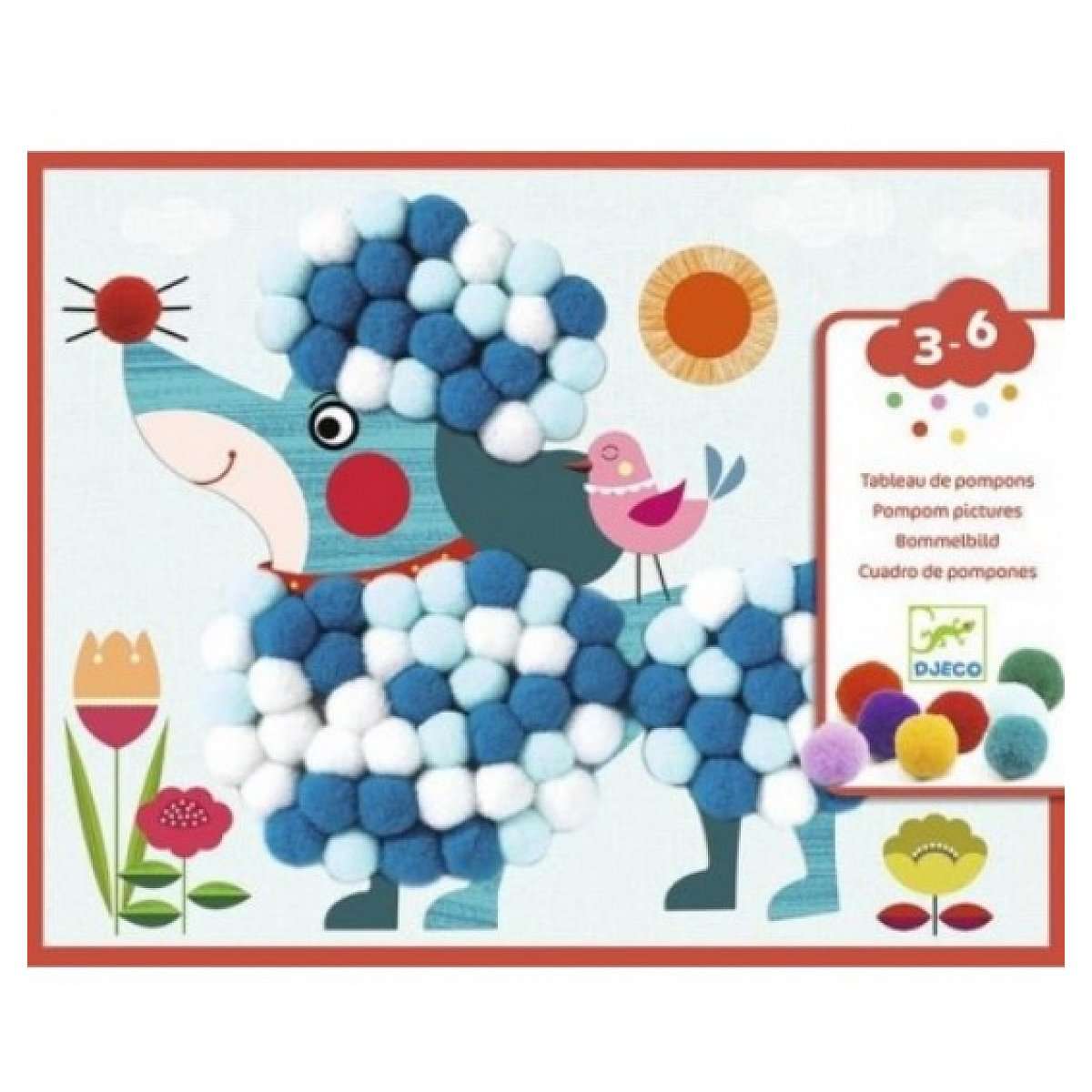 Ce coffret contient 3 chiens silhouettés en carton épais (avec zones autocollantes) et 200 pompons colorés à coller. Une fois décorer, votre enfant pourra caresser les 3 chiens avec les pompons très doux.