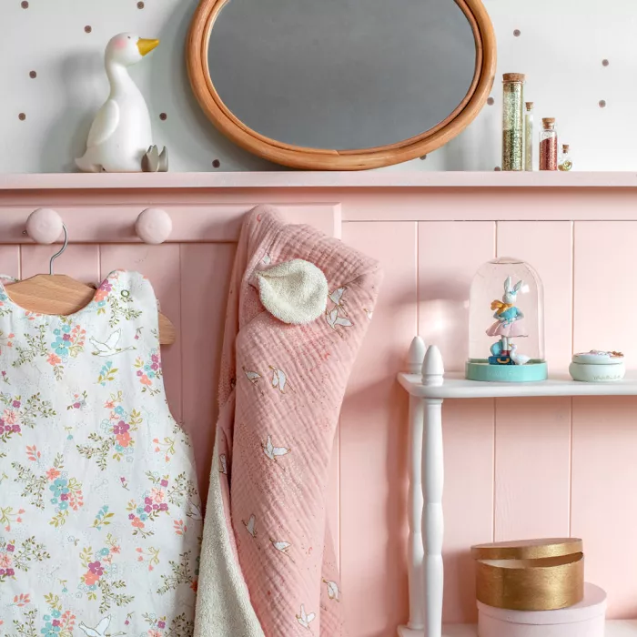 Cape de bain labelisé OEKO-TEX® STANDARD 100 – CQ1337/1 IFTH, 100% coton en lange et tissu éponge pour accueillir chaudement bébé a la sortie du bain. Adorable elle dispose de 2 petites oreilles de souris sur la capuche. Peut-être brode au prénom de l’enfant.