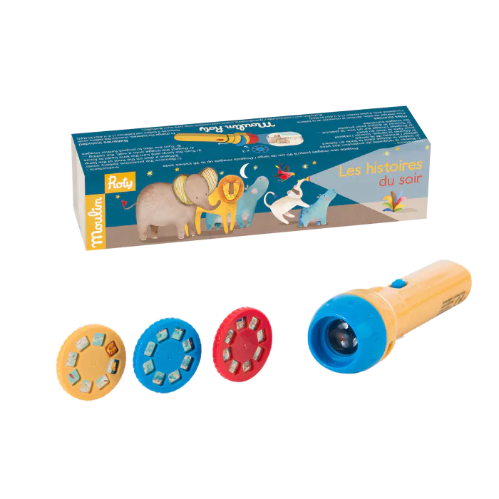 Pour endormir les tout-petits : Lampe torche de poche comprenant trois disques à emboîter. Chacun des disques, projeté sur le mur raconte une histoire en couleurs:- 1 : La douche des éléphants !- 2 : L’appel de la maman hippopotame !- 3 : La découverte des lionceaux !Illustrations aux couleurs douces, pleines de tendresse, représentant les personnages Papoum accompagnés chacun de leur tout – petit, réunis au beau milieu de la savane pour la baignade du soir.