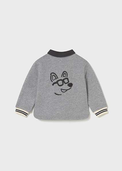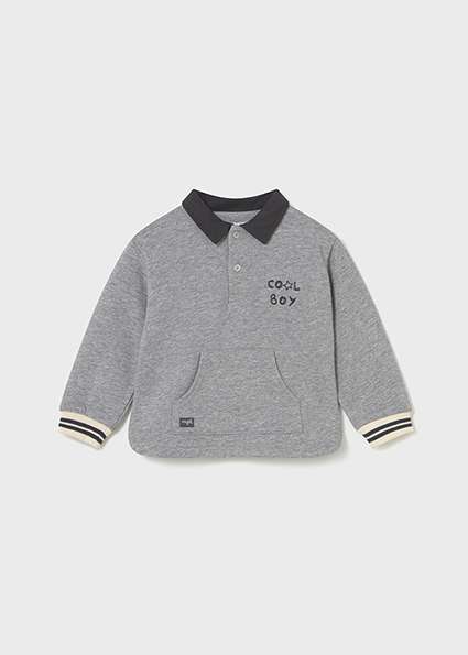 Sweat à manches longues pour bébé avec poignets élastiques contrastés. Col polo classique. Poche fonctionnelle à l’avant. Éléments décoratifs: broderies sur le devant et le dos du vêtement.