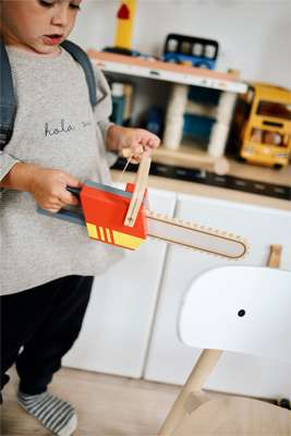 Avec le sac à dos des pompiers, le rêve de se glisser un jour dans le rôle des pompiers devient réalité. Équipé d’un tuyau d’incendie, d’une hache, d’un pied-de-biche, d’une radio, etc., le plaisir de jouer est illimité. Avec la tronçonneuse de jeu, nous coupons désormais tout en petits morceaux, lorsque nos enfants s’en servent pour se glisser dans différentes situations de jeu de rôle ».